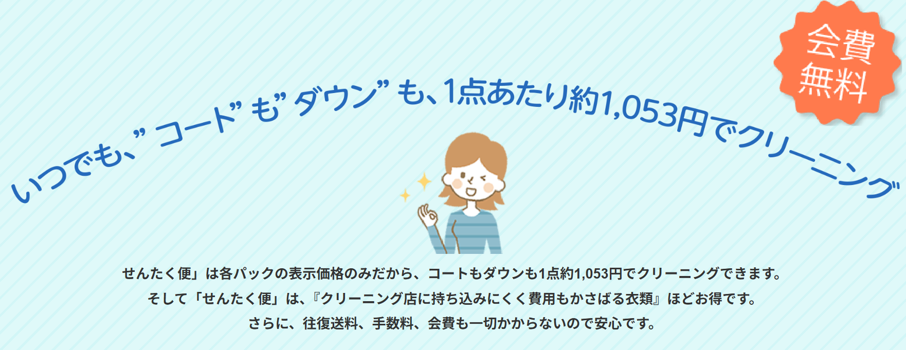 一番の特徴は、コートやダウン、スーツなど、普通のクリーニング店だと高くつく衣類も、パック料金でまとめて出せばとてもお得になること。しかも往復の送料や手数料、会費なども一切かかりません。